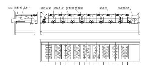 该机由人工上料或提升机上料进入该机,设有不同大小圆孔的分级滚筒从进料口处依次排列在滚筒托盘上(最小孔的分级滚筒在进料口处,向后是以滚筒上孔的大小,从小到大排列)。传动减速机通过链条传动带动拨料辊后,再通过链条带动滚筒托盘,从而转动滚筒;当圆果进入分级机后,小的圆果就会通过滚筒上的圆孔掉进出料斗中;而大一点的圆果会在前一个滚筒的转动下滚到下一个大一点孔的滚筒上,进行分级出料。若圆果分级过程中出现卡在滚筒的圆孔中时,在滚筒的内部设有拨料辊,把卡住的圆果顶出滚筒,并在拨料轴的作用下,快速将圆果送到下一个分级滚筒上。