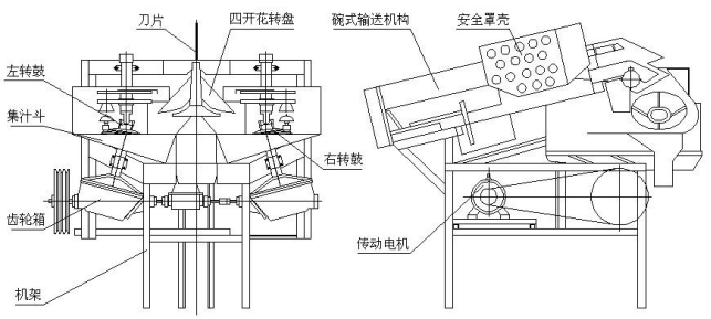 该机由机架、齿轮箱、集汁斗、左转鼓、刀片、四开花转盘、右转鼓、碗式输送机构、安全罩壳、传动电机的部件组成。